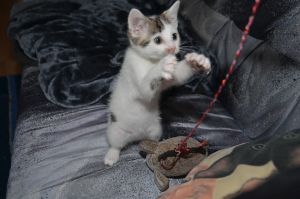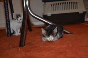 Ansonsten wachsen und gedeihen wir super, toben quer durch die Wohnung, spielen miteinander und üben das Anschleichen und die Jagd. Wir futtern wie die Mähdrescher damit wir gross und stark werden und geniessen einfach unser Katzenleben.