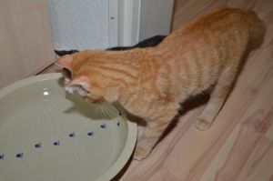 Chilli mag Wasser sehr und geniesst es, wenn man im Lavabo einen seichten Strahl laufen lässt. Dann pfötelt er oder versucht es zu fangen, was dazu führt, dass er öfters sein Köpfchen direkt unter dem Strahl hält. Doch das stört ihn überhaupt nicht, sondern er geniesst dies sichtlich