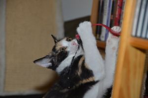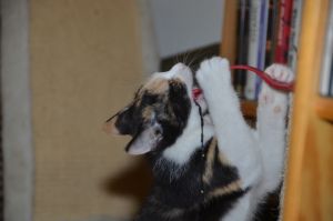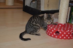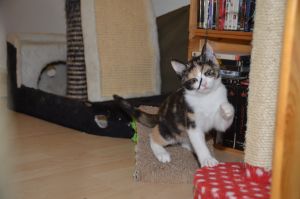 Als wir eintraten sahen wir Bibi kurz, doch zog sie es vor sich in die obere Etage zurück zu ziehen. Ihr Katzenkumpel Moritz dagegen zeigte sich gleich und so beschäftigten wir uns zuerst mit ihm. Als die Besitzer von Bibi sie kurz darauf holten, um sie uns zu zeigen, blieb sie dann auch bei uns.Das mitgebrachte Stinkie liess sie anfangs liegen, doch schon kurze Zeit später leckte sie genüsslich daran und fand es toll .