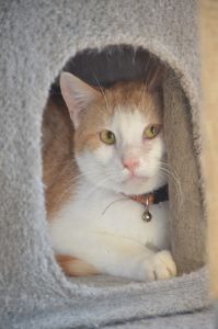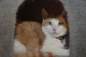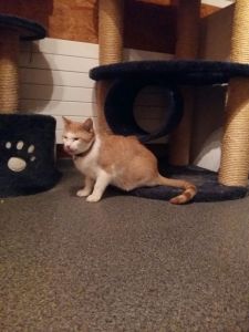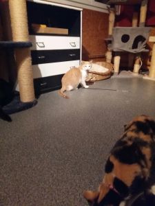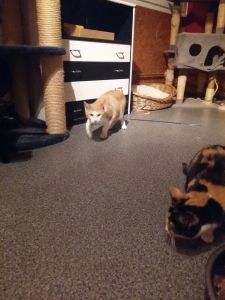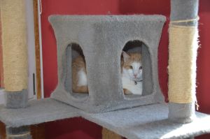 Garfield war gerade beim Fressen als ich eintrat, doch verzog er sich gleich in seine Kratzbaumhöhle als ich näher kam. Dort verbrachte er den ganzen Besuch und beobachtete uns aus Distanz. Er war weder scheu noch ängstlich, einfach etwas vorsichtig, da er mich auch nicht kannte.