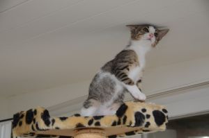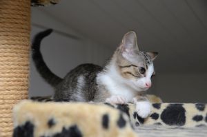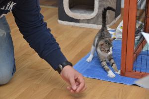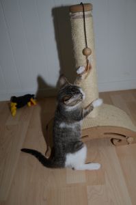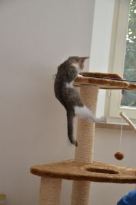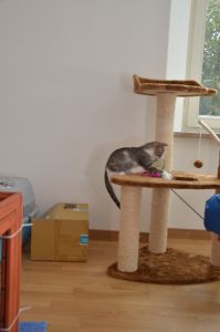 In der Pflegestelle angekommen, erwartete mich schon alles. Da stand ein schöner Kratzbaum, es gibt eine tolle Tonne und auch viele Spielsachen. Das Essen stand schon bereit und auch mein Klo war sauber und roch nach frischer Streu. Ich kann nur sagen, dass es mir hier super gefällt und ich mich innert Sekunden gleich wohl gefühlt habe