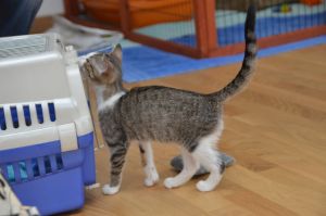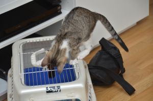Der Besuch war auch super. Die zwei Menschen hatten grosse Freude an mir und obwohl sie sich bereits in meine Fotos verliebt hatten, überzeugte ich live noch viel mehr. Nach einem lässigen Gespräch und etwas knuddeln und spielen, verabschiedete sich mein Pflegemami und Manu ganz lieb von mir und taten mich in die Transportbox. Danach wurde ich aus der Wohnung getragen und was dann kommt, erzähle ich Euch sicher schon bald.