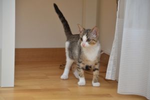 Chantal erzählte mir die lustigsten Dinge über Chelsea. Man stelle sich vor, die Kleine liebt nichts mehr als Türrahmen hochzuklettern. Den Vorhang daneben ignoriert sie komplett oder benutzt ihn mal als Rutsche. Doch sieht man keinerlei Krallenspuren, was mich bei einem so jungen Kätzchen doch eher erstaunte. Unsere Chelsea ist halt schon eine Lady und bei Vorhängen ein Vorzeigekätzchen