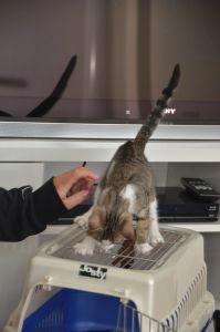 So fuhr Manu gleich los und holte mich dort ab. Sie sprach noch mit meinem Besitzer, der eigentlich gar nicht so übel ist, doch die Überforderung war ihm anzusehen. Nach dem Gespräch wurde ich lieb in die Transportbox getan und auch mein Lieblings Spielzeug wurde mir mitgegeben und auf ging meine Reise in die Pflegestelle. Im Auto musste ich ganz laut mauzen und plötzlich duftete es auch intensiv