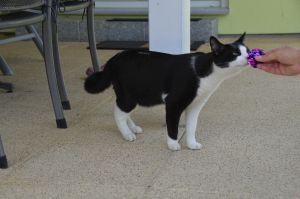 Merlin begrüsste mich gleich beim Eintreten und liess sich auch gleich streicheln. Er schnupperte mich genau ab und schnappte sich dann das mitgebrachte Stinkie, wobei er sich nur kurz damit beschäftigte, denn das Fellmäuschen und Bällchen fand er viel cooler