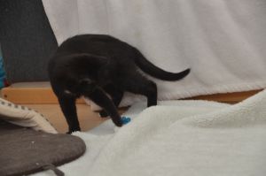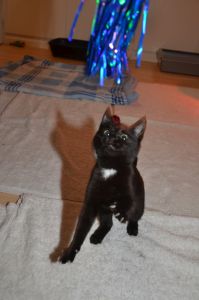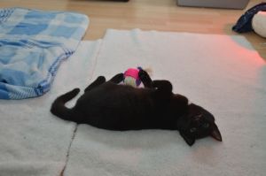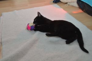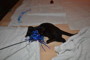 Heute hat Manu ein paar Schnappschüsse von uns gemacht, wie wir mit ihr spielen. Wobei Nouvel An lieber mit den Schnüren spielte als mit der Angel. Mir soll es recht sein, so hatte ich diese ganz alleine für mich und fand es einfach toll. Es ist immer lässig, wenn Manu mit uns spielt, so können wir uns austoben und hinter den Bällchen her springen oder wie beschrieben die Angel jagen.