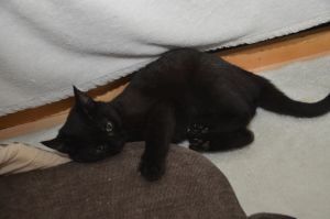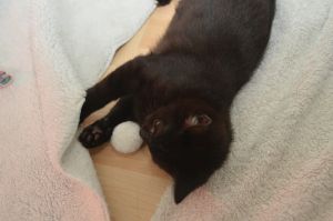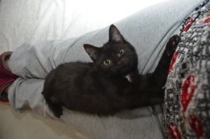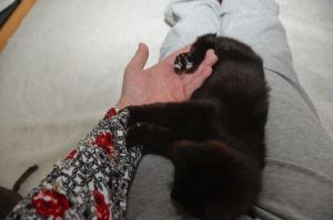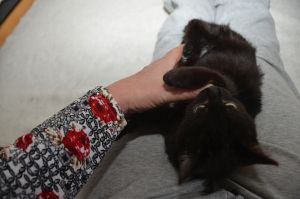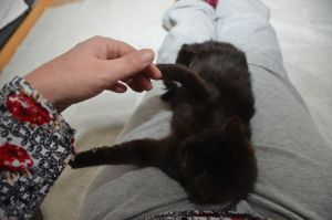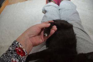 Ansonsten werden wir hier in der Pflegestelle verwöhnt und viel bespasst. Wir dürfen auf den Menschen herum klettern und unsere Flausen ausleben. Gerade hat Noël sich auf den Rücken gelegt und ihr Bäuchlein zum streicheln präsentiert, schon hält sie mit ihren Pfötchen das Pflegemami fest und beginnt zu strampeln. Alles natürlich spielerisch, doch manchmal muss Manu ihr auch sagen, dass sie ihre Krällchen eingezogen behalten soll