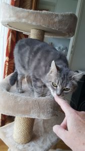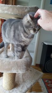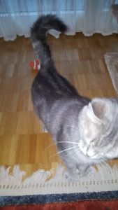 Seit ein paar Tagen geht es mir jedoch nicht mehr ganz so gut. Ich habe den Katzenschnupfen und musste oft niesen und husten, wenn meine Nase wieder verstopft war. Beim Atmen tönt es manchmal wie ein „schnorcheln, pfeifen“. Meine Leute machten sich grosse Sorgen, denn ich glaube sie haben mich wirklich lieb gewonnen. Sie geben sich viel Mühe und haben grosse Geduld um mit mir Körperkontakt aufzubauen. Seit ca. 3 Tagen habe ich nun selber gemerkt, dass es ganz lässig ist, wenn man sich streicheln und kraulen lässt! Noch nicht ganz überall, aber das kommt dann sicher auch noch. Hingegen macht es grossen Spass mit zwei neuen Freunden zu spielen. Die beiden Fell-Mäuse sind zwar nicht so „lebendig“ wie ich, aber wir haben trotzdem viel action miteinander