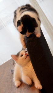 Naira spielt am liebsten mit einem Korkzapfen oder gräbt mit ihrer Schwester Blumentöpfe aus. Zum Entspannen wird der Balkon zur Aussichtsplattform, selbstverständlich wird dies nur unter Aufsicht gestattet, denn Sicherheit geht vor. Letta spielt sehr gerne mit Naira oder den Vorhangkordeln, zu was sonst wären diese gut