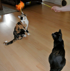 Aber Donut spielt ja auch mit uns. Manchmal rangelt er aus lauter Jux mit Keks. Der kleine Keks – mein Bruder, wisst ihr noch? – hat sich gemacht. Er hat am Anfang ganz viel unter dem Sofa gesessen und unsichtbar gespielt. Aber inzwischen ist er immer mehr mit dabei.