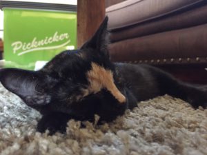 Ausserdem war es im Haus immer noch total warm und wir haben uns überall hin, wo ein laues Lüftchen weht, verteilt. Nur Pie, die verrückte Nuss, hat sich in die Sonne gelegt.