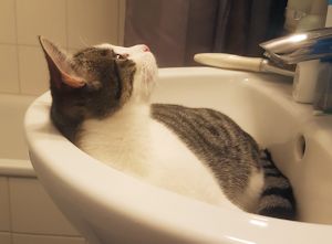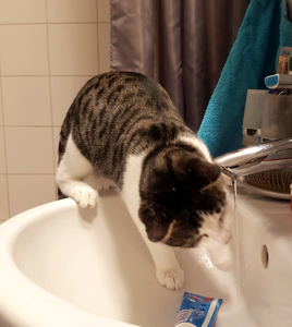 Auch im Bad ist man vor Leo nicht sicher. Er sitzt dabei gerne in der Badewanne und schaut zu. Leo apportiert auch gerne. Wenn die neuen Besitzer ein Spielzeug werfen, bringt er es wieder zurück und legt es vor die Füsse.