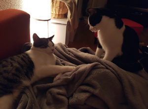 Die neuen Besitzer können keinen Schritt ohne die beiden mache. Am Abend wird z.B zusammen gekocht. Da sitzen Leo und Jimmy auf ihren Kissen und schauen zu wie das Essen zubereitet wird