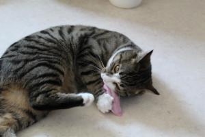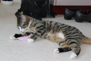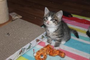 . Er jagt gerne alles mögliche in der Wohnung, Spielzeug und Fliegen, usw., einfach was ihm gerade in Sichtweite kommt. Mit Stinkis kann man ihn unglaublich begeistern und die werden dann auch verteidigt.