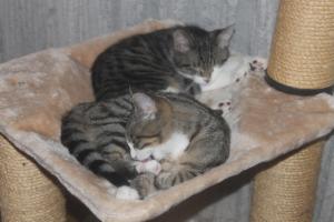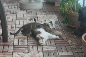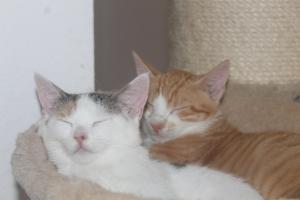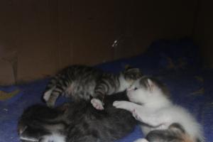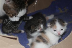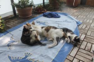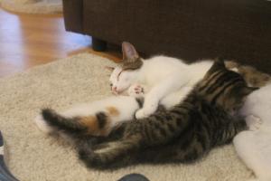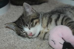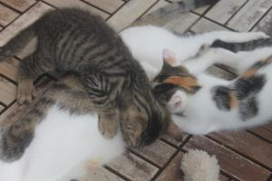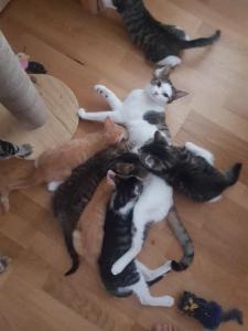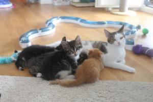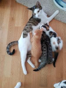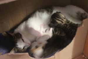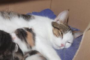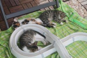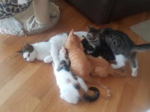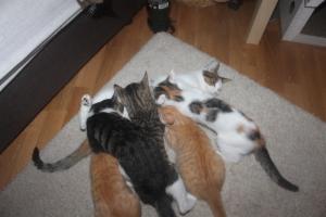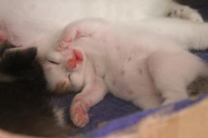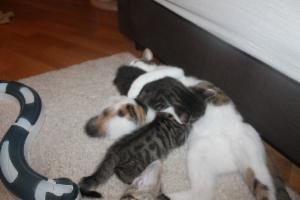 Sogar Mama Dinah war über eine Woche einfach nur am Schlafen, es ging ihr nicht gut und sie wollte nur ihre Ruhe haben. Wir durften auch nur wenig bei ihr trinken, was unser Pflegemami aber nicht toll fand, denn ein Milchstau wäre absolut nicht auch noch erwünscht gewesen!