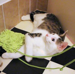 Grey mag alles was sich bewegt und so ist keine Kette, kein Haarband oder sonst irgend etwas vor ihm sicher. Im Moment haben die beiden Wildfänge einen grossen Balkon zum Toben, den sie gerne nützen. Shalulu und Grey haben ein tolles Zuhause bekommen.