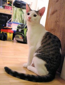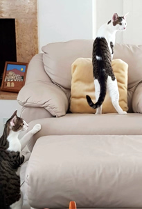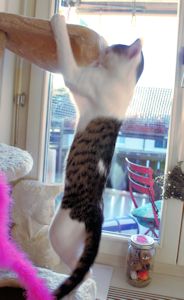 Archie hingegen ist sehr ausgeglichen und verspielt, mag aber Schmuseeinheiten aber ebenfalls sehr. Er ist ein richtiger kleiner Akrobat, nichts ist ihm zu hoch, er kommt überall hin und springt von Kratzbaum über die Wohnwand auf die höchsten Schränke. Am Anfang, als beide noch nicht nach draussen durften, brauchte die Besitzerin manchmal sehr viele Nerven und viel Geduld, wenn die zwei wie wild durch die Wohnung tobten