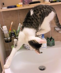 Was ich besonders liebe ist Wasser! Ich liebe es aus dem fliessendem Wasserhahn zu trinken, dies sieht sehr akrobatisch aus, sagt mein Pflegemami!