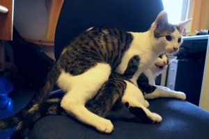 Sie verstehen sich auch mit dem dritten Kater im neuen Zuhause. Kaum setzt man sich irgendwo hin springt Grey gleich auf die Beine und lässt sich verwöhnen. Auch Shalulu kommt immer wieder und liebt es gestreichelt zu werden