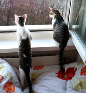 Inzwischen sind sie aber begeisterte Freigänger, hören jedoch (noch) auf die Rufe der Besitzerin und kommen nach Hause, wenn es draussen zu heiss ist, oder abends, wenn es ins Bett geht. Die Nacht über verbringen die beiden im Moment noch drinnen. Vor allem Archie ist ein guter Jäger und fängt mit Leichtigkeit kleine weisse Schmetterlinge, die er dann auch gleich verspeist. Wenn...