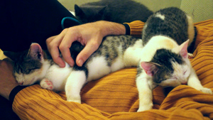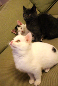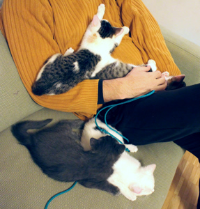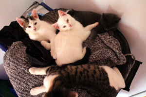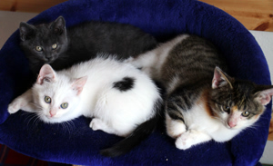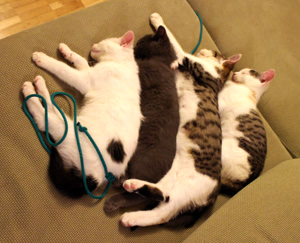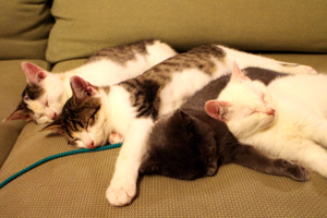 . Dies hat auch Natsu gehört und siehe da, er kam auch und ist auf den Pflegepapa gehüpft und wollte gestreichelt werden. Das war einfach so schön! Als der Papi aufstehen musste, hat er uns neben die anderen gelegt aufs Sofa und mein Pflegemami hat gesagt, jetzt sehen wir aus wie die Bremer Stadtmusikanten