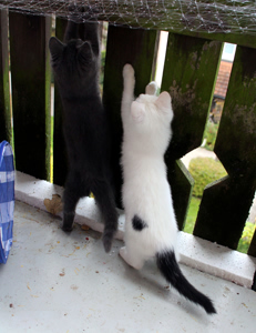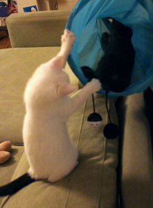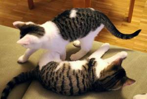 Wir haben einen neuen Lieblingsplatz! Das Elternzimmer wurde uns geöffnet, zwar nur am Tag und ohne Kuscheldecken, was wir zwar ziemlich schade finden, aber unser Pflegemami weiss schon warum. Auch würde sie wohl in der Nacht kein Auge zu tun, denn der Lieblingsplatz befindet sich auf dem Schrank. Dieser ist aus Stoff und wir klettern rauf, wie auf einen Baumstamm, wenn dann einer von uns schon oben ist, müssen wir immer wieder raufklettern und runterspringen und so kann das Stunden gehen! Ein tolles Spiel