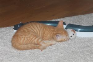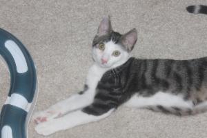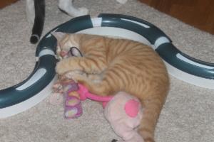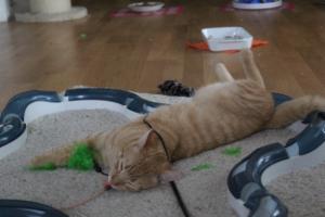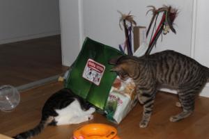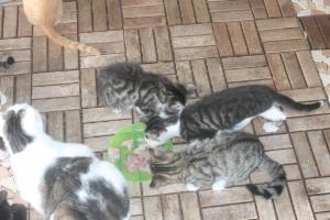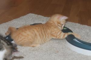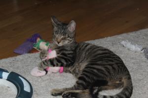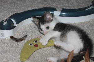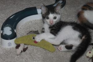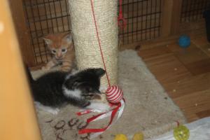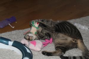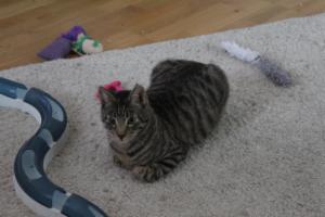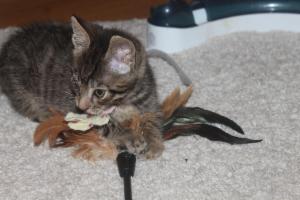 Wir spielen am liebsten mit den Spielangeln oder jagen Bälle und Fellmäuse durch die Wohnung. Am tollsten ist es aber, wenn der Freigänger vom Pflegemami eine richtige Maus mitbringt