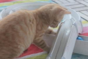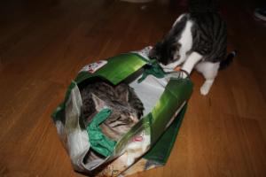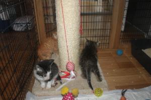 ! Im Verstecken ist sie übrigens auch sehr gut, kaum merkt sie, dass SIE zum Tierarzt muss! Manchmal hat sie Tage, da geht sie uns auch aus dem Weg und möchte einfach nicht mit uns spielen. Sie ist immer noch sehr hungrig und wenn der Teller leer ist und das Pflegemami nicht schnell genug ist, so beisst sie ihr immer in die Zehen oder die Nase. Norek hat das unterdessen schon super kopiert und macht es nun auch wenn er Hunger hat