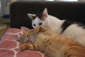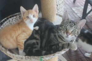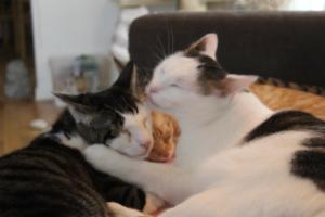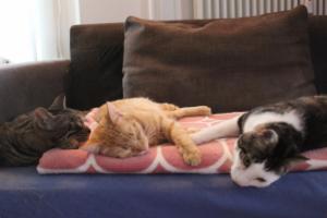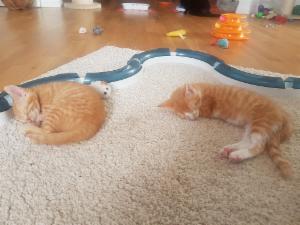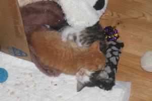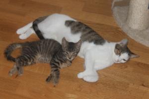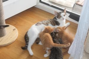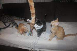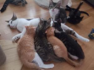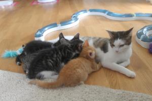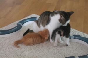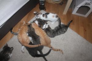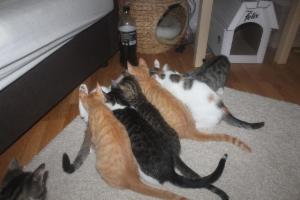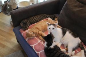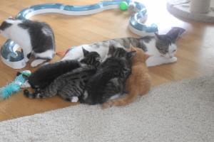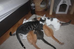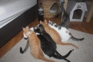 Am schönsten aber ist es immer noch, dass Dinah uns alle einfach bei sich nuggeln lässt und wir zwischendurch noch etwas geputzt werden von ihr. Die anderen, grossen Katzen finden uns aber auch immer cooler und gemeinsames Spielen und Jagen ist unterdessen an der Tagesordnung