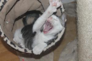 Nur langsam scheinen die Augentropfen nun zu helfen und das neue Antibitoka welches alle seit ein paar Tagen bekommen! Da der Katzenschnupfen auch die Schleimhäute angreift, hatten vor allem Sinus und Norek ständig offene Stellen im Mund und auf der Zunge! Trotz allem haben die beiden gefressen und haben nicht gross Gewicht verloren.