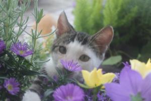 Wir sind einfach so wie Kitten sind in diesem Alter sind… nämlich neugierig wie sonst was und wir wollen auch ständig helfen! Zum Beispiel haben wir die „Genuss- und Riechprobe“ gemacht als sie plötzlich mit neuen Blumen da stand! Das war ein toller Nachmittag, denn wir haben natürlich auch geholfen beim Einpflanzen