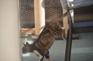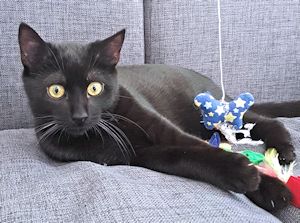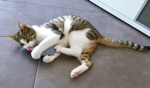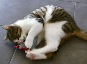 , erzählen mir seine Besitzer. Beim Spielen packt er gerne seine Beute und trägt sie durch die Wohnung, oder nachts auch ins Bett seiner Besitzer. Denen habe er früher auch ab und zu in die Füsse gebissen während sie schliefen