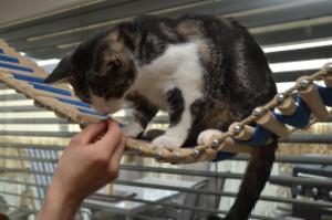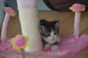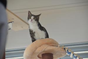 Vor der Türklingel hat der kleine Babou noch etwas Angst und er versteckt sich im hintersten Eckchen seines Katzenbaums. Nach kurzer Zeit taut er aber auf und begrüsst Fremde