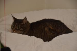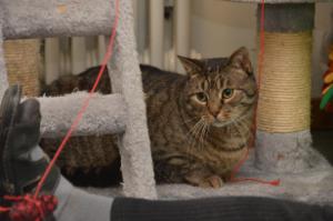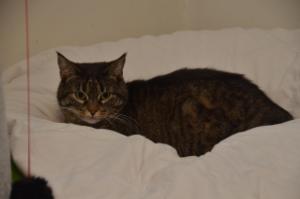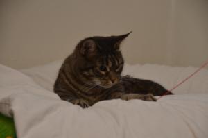 Als ich eintrat sass Jerry unter dem Kratzbaum und schaute mich gelassen an. Lea lag auf ihrem Bettchen und zeigte sich entspannt. Beide genossen es mit der Schnur zu spielen, welche ihnen ihre Besitzerin immer wieder zuwarf, während wir uns über die beiden hübschen Tigerli unterhielten. Meine mitgebrachten Spielsachen waren nicht so interessant wie die Schnur und mir wurde erzählt, dass die beiden das Spielen erst erlernen mussten und vorallem Jerry heute mit viel Freude hinter den vielen Mäuschen oder Bällchen herspringt. Man hört ihn sogar in der unteren Etage, wenn er seine Spiellaune auslebt