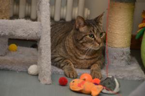 Nach einiger Zeit hat sich immerhin Pumpkin doch in meine Nähe gewagt und sich ein bisschen mit den Spielsachen beschäftigt. Die Besitzerin konnte ihn auch gut mit einer Spielangel locken. Pumpkin ist ein wunderhübscher rot-getigerter Jungkater mit einem süssen Gesichtchen, ausdrucksvollen Augen und einem flauschigen Fell