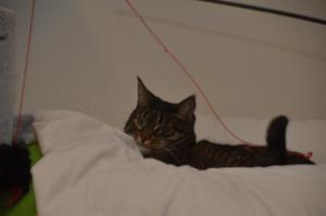 Er spielt sehr gerne mit der Angel und seine Besitzer erzählten mir, welch tolle Sprünge er vollführen kann. Einen zeigte er auch uns. Auch das mitgebrachte Stinkie bespasste er ab und zu, wie er auch sein Interesse an Mäuschen hatte. Doch die Angel hat es ihm mit Abstand am meisten angetan. Er vollführte so einige Kapriolen auf dem Kratzbaum und ich erfuhr, dass er sich manchmal nicht als Trapezkünstler zeigt, sondern eher auf eine lustige Weise seinen Weg in die Hängematte findet. Während dem Spiel fand ich heraus was damit gemeint war, denn er nahm einen zu grossen Schritt und der ging ins Leere