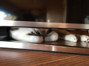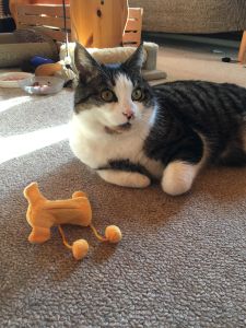 oder er sitzt auf der Sofalehne, um den Vögeln zuzuschauen. Dabei klopft er manchmal schon ganz kräftig an die Scheibe, um doch endlich eines dieser interessanten „Flatterdinge“ zu erwischen. Im Moment muss er sich mit einem Federspielzeug begnügen, was ihm aber ebenfalls ausgesprochen Spass macht.
