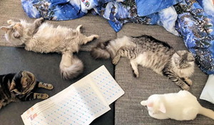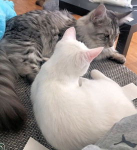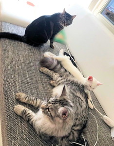 Die beiden sind zu wunderschönen, ziemlich lebhaften, verspielten und verschmusten Katern geworden. Sie sind sehr neugierig und Taschen – erst recht wenn sie nach einer anderen Katze riechen, sind einfach unwiderstehlich