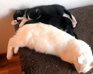 . Neuestens legen sie sich vor die Haustüre, wenn die Besitzerin zur Arbeit muss, wohl in der Hoffnung, dass sie das davon abhält, das Haus zu verlassen. Abends wird sie dann entsprechend ungeduldig erwartet und freudig begrüsst