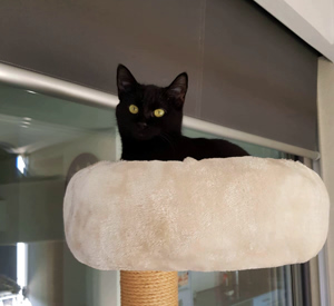 Der schöne grosse Balkon ist gut gesichert und auch dort gibt es einen hohen Kratzbaum, auf dem Nala ganz oben „trohnt“....