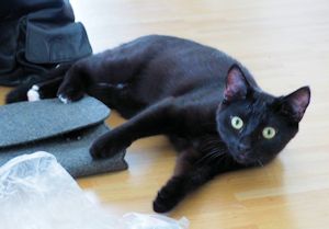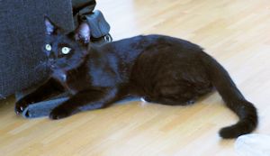 Balu mit seinem schwarzen Fell und den paar weissen Flecken ist mit seinen leuchtenden Augen faszinierend anzusehen. Er ist der anhänglichere der beiden, verfolgt seine Besitzer auf Schritt und Tritt und schwatzt sehr viel.