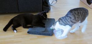 Beide sind sehr verspielt und jagen gerne ihren Spielsachen durch den langen Gang nach. Sie haben unglaublich viel Energie und vor allem nachts geht die Post ab