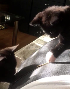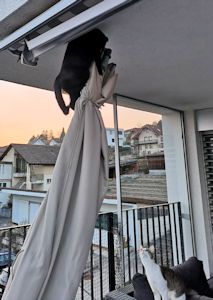Auch mit ihrem Kumpel verstehen sich die beiden super. Sie toben gerne zusammen durch das grosse Haus. Vor allem nachts machen sie gern Party und jagen durch die 3 Etagen, die ihnen zu Verfügung stehen