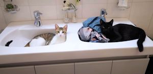 Beide sind überhaupt nicht wasserscheu und trinken am liebsten entweder aus dem laufenden Wasserhahn – in der Badewanne stehend (nasse Pfötchen machen da gar nichts aus) – oder aus Wassergläsern. Diese dienen manchmal auch dazu, um die Pfoten drin zu baden. Dann finden die Besitzer nicht nur Wasser, sondern auch mal Katzensand in ihren Gläsern