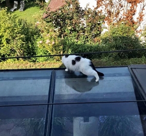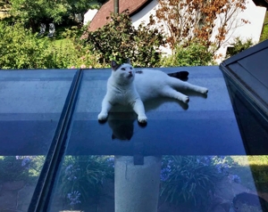 . Ihr fällt immer mal wieder was Neues ein. Sie liebt die Höhe und springt problemlos vom Sofa auf das Büchergestell ganz oben. Als die Besitzer eines morgens auf der Terrasse beim Frühstück sassen, staunten sie nicht schlecht, als über Ihnen auf dem Glasdach plötzlich Ayla auftauchte