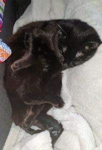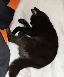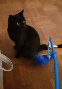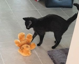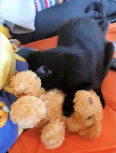 . Aber plötzlich war er interessant. Ich beschnupperte ihn, er roch irgendwie speziell, meine Pflegemami hat mir gesagt, das sei Katzenminzepulver, das sie extra auf den Teddy gemacht hatte. Wie gesagt, der Teddy wurde interessant. Ich nahm ihn und spielte mit ihm, legte mich auf den Rücken, wälzte mich am Boden und immer eingeklemmt zwischen den Pfoten dieses Plüschtier.