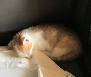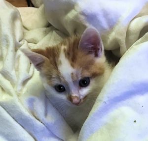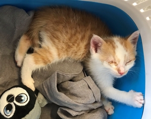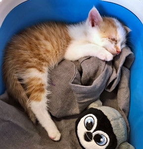 . Ich nahm sie aus der Box auf den Arm, streichelte sie und schon begann sie zu schnurrlen. Sie hat ein recht lautes Motörchen. Dann fiel mir ihr Auge auf, irgendwas war da nicht wie es sein sollte, denn es war sehr nass. Ich sprach noch mit der Frau, die sie mir gebracht hatte und erfuhr, dass sie laut Tierarzt ein Problem mit dem 3. Augenlid hat, aber dass das mit Augentropfen gut in den Griff zu bekommen sei.