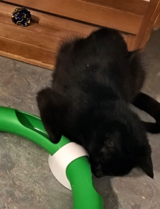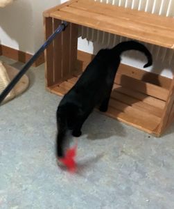 . Er wollte die ganze Zeit raus, durfte aber wegen der vielen Flöhe, die er hatte, noch nicht. Er blieb also erst einmal in dieser Box im Badezimmer, was für niemanden sehr angenehm war, für mich nicht, die jedesmal über ihn steigen musste und für ihn nicht, weil er sooo gerne raus zum Spielen wollte. Das ging ein paar Tage lang so und ihr könnt mir glauben, es war gar nicht toll