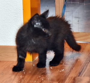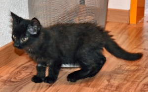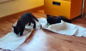 (Wasser ist doch soo nass und gruuusig!) Wir haben es ihm auch mit heftiger Gegenwehr gedankt und er hat einige Kratzer abbekommen! Nachdem auch der vierte von uns sauber im Zimmer angekommen ist (wo übrigens schon die drei von der Gruppe Ramona’s Kitten waren), liess er uns erstmal alleine und wir konnten die neue Umgebung kennenlernen. Pflegepapi hatte noch das Vergnügen die Transportbox und sich zu reinigen