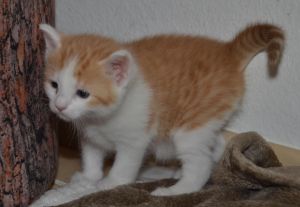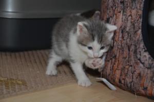 Tja, man kann leider nicht immer alles haben, doch zeigen wir jeden Tag mehr, dass wir kleine Jäger sind und das Kämpfen lernen. Spielerisch greifen wir uns gegenseitig an, tragen unsere Beute im Mäulchen herum, versuchen uns anzupirschen und aus der Deckung heraus unsere Beute – meist die eigenen Brüder – zu jagen. Das macht echt Spass!